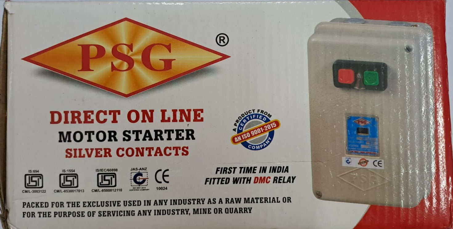 डायरेक्ट-ऑन-लाइन मोटर स्टार्टर को स्टार्ट (हरा) और स्टॉप (लाल) के लिए पुश बटन द्वारा नियंत्रित किया जाता है और इसमें एक कॉइल संचालित कॉन्टैक्टर सी होता है।